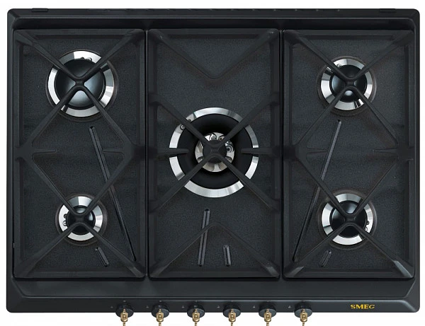 Варочная панель газовая Smeg SRV876AOGH имеет приятный ретро — налёт, но с достаточно интересным дизайном. Базовый цвет варочной панели Smeg SRV876AOGH — антрацит. Этот оттенок на данный момент стал более актуальным, чем классический чёрный. Латунная фурнитура отлично с ним сочетается. Нетривиальный дизайн держателей создаст изысканный акцент на кухне. Они выполнены из чугуна. Это крепкий материал, который готов служить долгие годы. Но производитель не советует мыть решётки в посудомоечной машине, поскольку это может привести к коррозии.