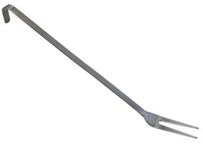 Вилка поварская MVQ 40см 320020 предназначена для выемки больших приготовленных кусков мяса, рыбы и птицы из посуды, а также для придерживания их при последующей разделке на предприятиях общественного питания и торговли. Изделие оснащено 2 зубцами и длинной ручкой с крючком на конце для удобного хранения.