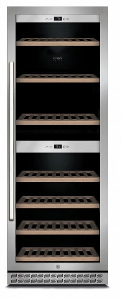 Семь съемных полок из дерева предназначены для правильного хранения вина: бутылки кладутся горизонтально (вместительность – 126 бутылок). Деревянные полки оборудованы фиксаторами от самопроизвольного выдвижения и компенсируют механические воздействия компрессора и вентилятора. Благодаря функции WiFi Smart Control, через мобильное приложение CASO-APP, можно удаленно следить за параметрами вашего винного шкафа и менять их в случае необходимости. Управление осуществляется при помощи двух сенсорных панелей. Регулировка температурных показателей с шагом в 1°C происходит нажатием « ∧ » и «∨». Управление внутренним освещением возможно при помощи кнопки «Свет». Чтобы прочитать этикетку, не нужно открывать дверь холодильника — светодиодные панели включаются кнопкой на внешней панели управления.