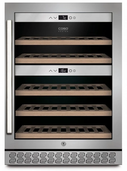 Пять съемных полок из дерева предназначены для правильного хранения вина: бутылки кладутся горизонтально (вместительность – 40 бутылок). Деревянные полки оборудованы фиксаторами от самопроизвольного выдвижения и компенсируют механические воздействия компрессора и вентилятора. Параметры холодильника задаются вручную, а также при помощи мобильного приложения «CASO-App». Возможна удаленная смена настроек из любой точки мира. Управление осуществляется при помощи двух сенсорных панелей. Регулировка температурных показателей с шагом в 1°C происходит нажатием « ∧ » и «∨». Управление внутренним освещением возможно при помощи кнопки «Свет». Встроенные светодиоды не нагреваются, и внутренний микроклимат остается максимально благоприятным для хранения бутылок.