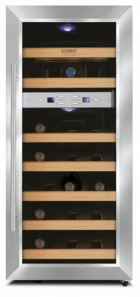 Семь съемных полок из дерева предназначены для правильного хранения вина: бутылки кладутся горизонтально (вместительность – 21 бутылка). Управление осуществляется при помощи двух сенсорных панелей внутри холодильника. Кнопка «C/F» - переключатель режима температуры с градусов Цельсия, на Фаренгейт. Регулировка температурных показателей с шагом в 1°C происходит нажатием « ∧ » и «∨». Управление внутренним освещением возможно при помощи кнопки «Свет». Красивая подсветка силуэтов бутылок синим цветом, обеспечивается за счет светодиодных панелей. Встроенные светодиоды не нагреваются, и внутренний микроклимат остается максимально благоприятным для хранения бутылок.