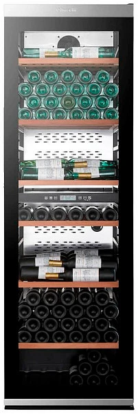 Шкафы этой серии оснащены полками из прочного, устойчивого к гниению дерева сапеле (6 полок), которые можно сдвигать, чтобы обеспечить хранение в перевернутом виде или с видом на этикетки винных бутылок.