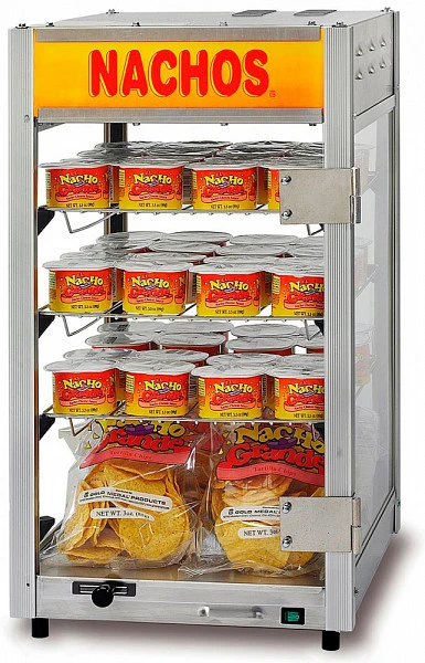 Витрина для порционных чипсов начос и соусов Gold Medal 5587EX вместимостью 60-70 банок оснащен 3 решетчатыми полками, 1 дверцей.