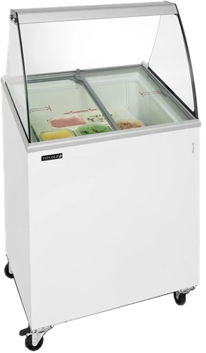 Модель представляет собой наклонную морозильную камеру с наклонными сдвигающимися стеклянными крышками вместо горизонтальных. Более низкая передняя панель этой морозильной камеры обеспечивает лучший обзор содержимого, благодаря чему она представляет собой еще более удачный вариант витрины для порционной продажи мороженого.