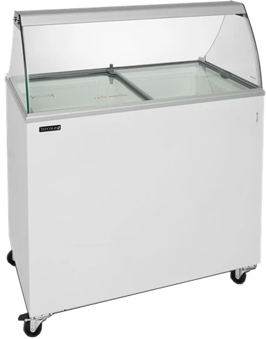 Модель представляет собой наклонную морозильную камеру с наклонными сдвигающимися стеклянными крышками вместо горизонтальных. Более низкая передняя панель этой морозильной камеры обеспечивает лучший обзор содержимого, благодаря чему она представляет собой еще более удачный вариант витрины для порционной продажи мороженого.