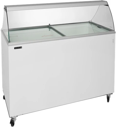 Модель представляет собой наклонную морозильную камеру с наклонными сдвигающимися стеклянными крышками вместо горизонтальных. Более низкая передняя панель этой морозильной камеры обеспечивает лучший обзор содержимого, благодаря чему она представляет собой еще более удачный вариант витрины для порционной продажи мороженого.