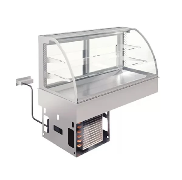 Модель имеет 2 стеклянные полки для выкладки продукции и охлаждаемую ванну из нержавеющей стали.
