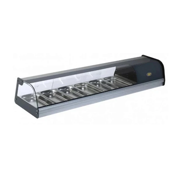 Витрина предназначена для для презентации холодных закусок, мяса, рыбы, овощей и т.д. Электронный термостат обеспечивает точную регулировку температуры. Витрина изготовлена из нержавеющей стали, отделка из анодированного алюминия. Вместимость 6 GN 1/3.