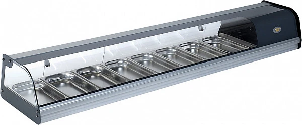 Витрина предназначена для для презентации холодных закусок, мяса, рыбы, овощей и т.д. Электронный термостат обеспечивает точную регулировку температуры. Витрина изготовлена из нержавеющей стали, отделка из анодированного алюминия. Вместимость 8 GN 1/3.