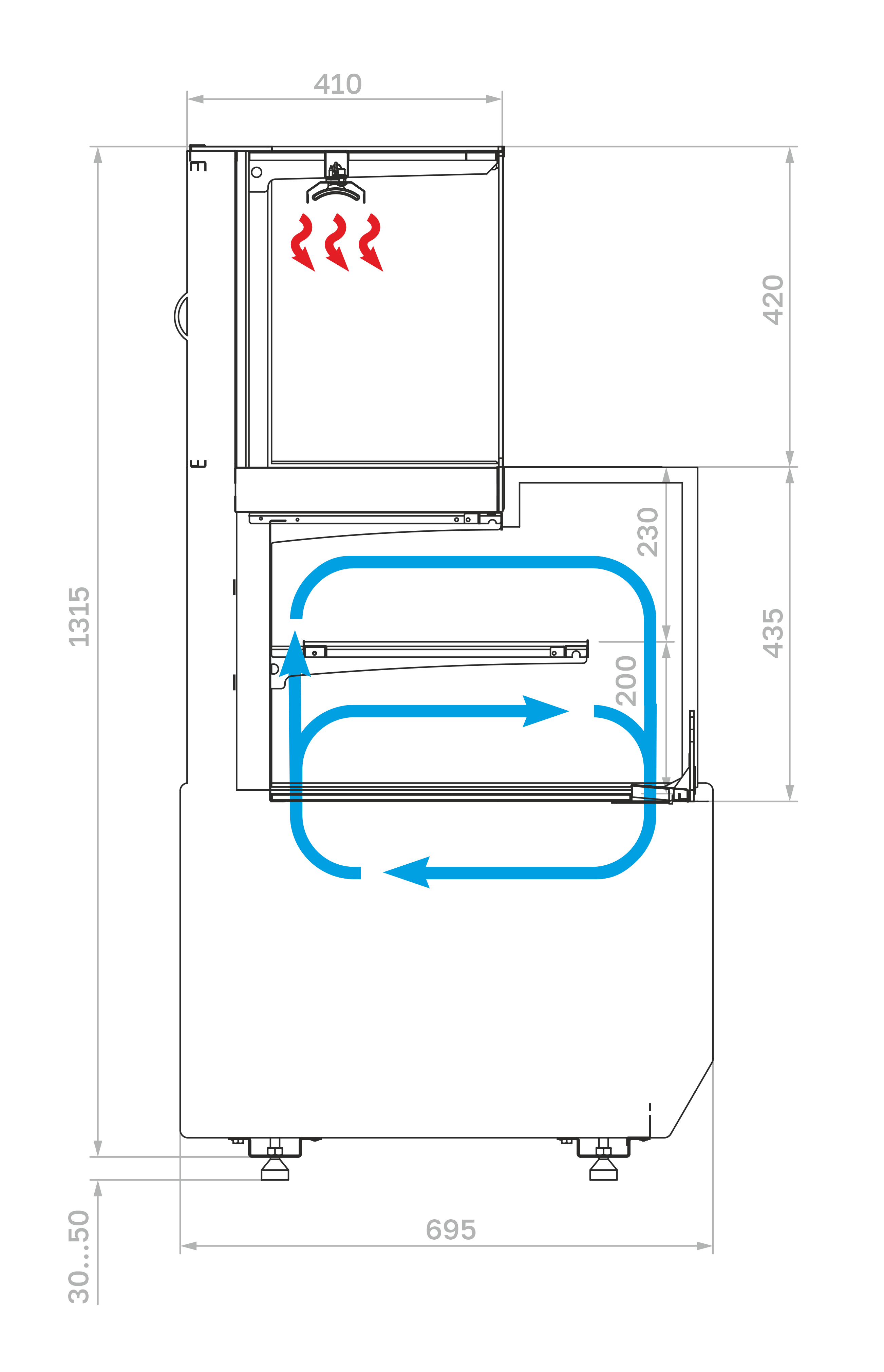 Верхний объем (SH): зона подогрева (+65°… +80°C) с сухим нагревом для идеальной сохранности качества продуктов. С передним стеклом для обслуживания на стороне оператора.