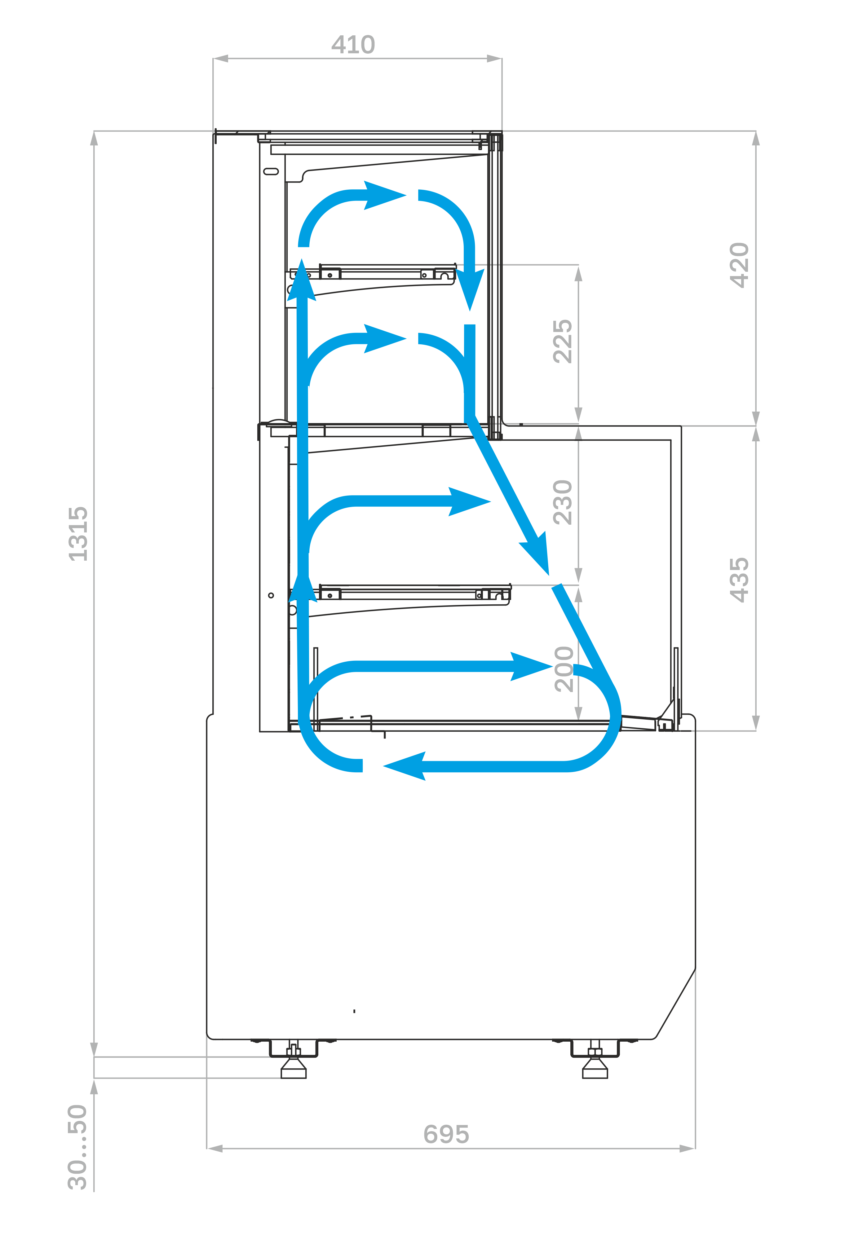 Верхний объем: доступ и загрузка продуктов осуществляется с задней стороны витрины через двери слайдер. В объеме предусмотрена дополнительная полка на регулируемых по высоте кронштейнах.