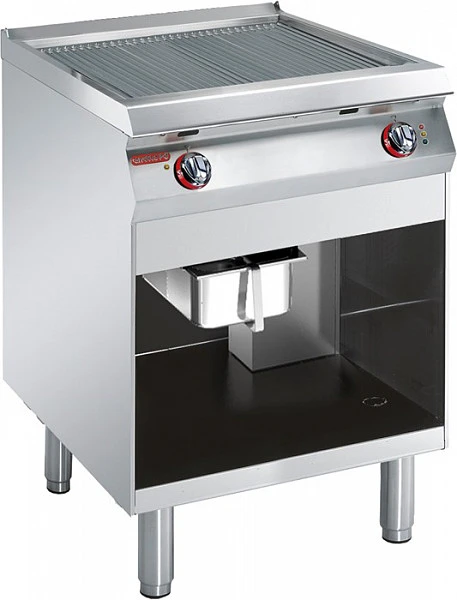 Гриль-сковорода непосредственной жарки двухсекционный напольный с ребристой жарочной поверхностью размером 645*525 мм из Fe510D стали с матовой отделкой- функциональный элемент линии Gamma.