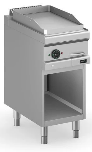 Модель с закругленными краями и бортами оснащена электромеханической панелью управления с терморегулятором и 2 световыми индикаторами, выдвижным лотком для сбора остатков пищи, масла и жира и открытой подставкой с регулируемыми по высоте ножками.