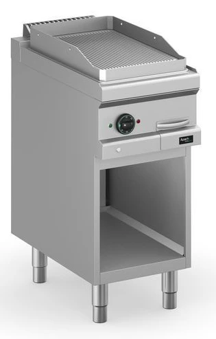 Модель с закругленными краями и бортами оснащена электромеханической панелью управления с терморегулятором и 2 световыми индикаторами, выдвижным лотком для сбора остатков пищи, масла и жира и открытой подставкой с регулируемыми по высоте ножками.